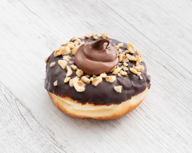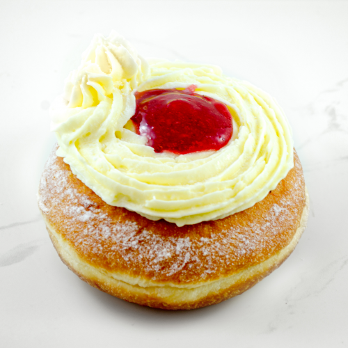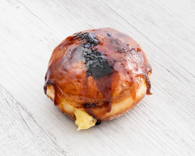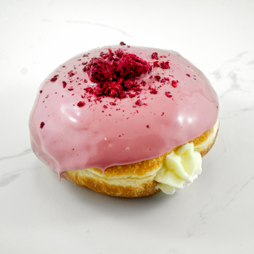 Choc raspberry Cruller Our hand piped choux pastry, dipped in chocolate ganache & topped with raspberry crisps