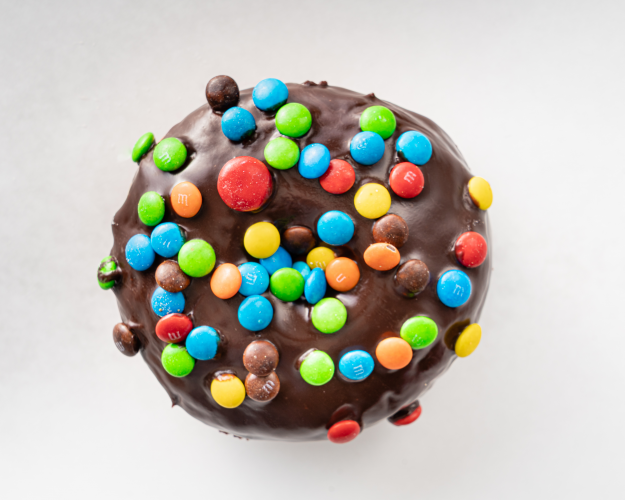 M&M RING Chocolate ganache glaze, covered in M&M Mini's -