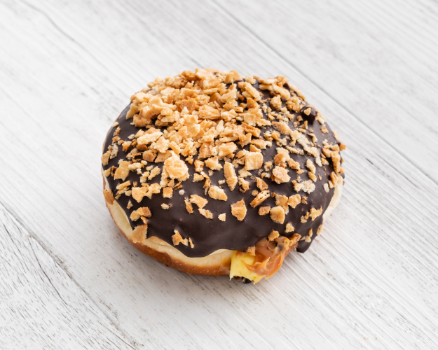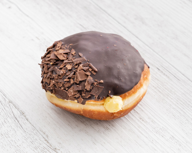 Boston Cream Chocolate ganache, vanilla bean pastry cream filling, sprinkled with choc flakes
