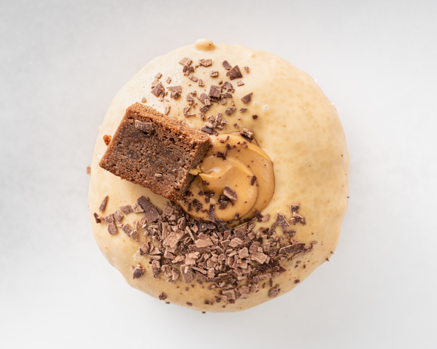 Gold Cruller Our hand piped choux pastry, dipped in caramelised white chocolate & flakes